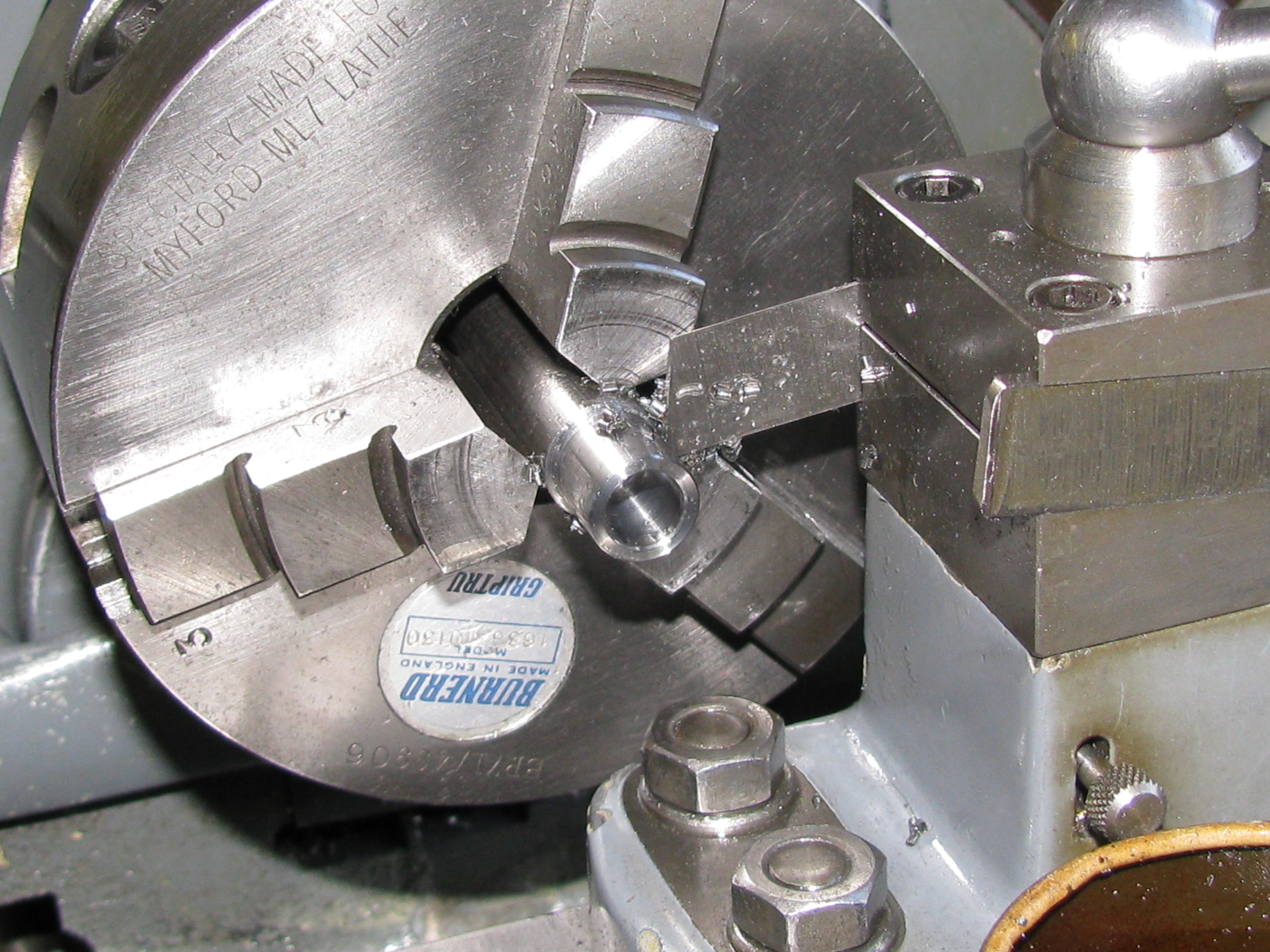 Having tried the slotting tool (a broken 1⁄16″ wide parting tool again) in a toolholder I decided it would be better to turn it over and cut at the back as I thought this would make it easier to set it to centre height. I turned it over and clamped it too tightly, shattering the blade. This prompted a tool grinding session. (5 hours)