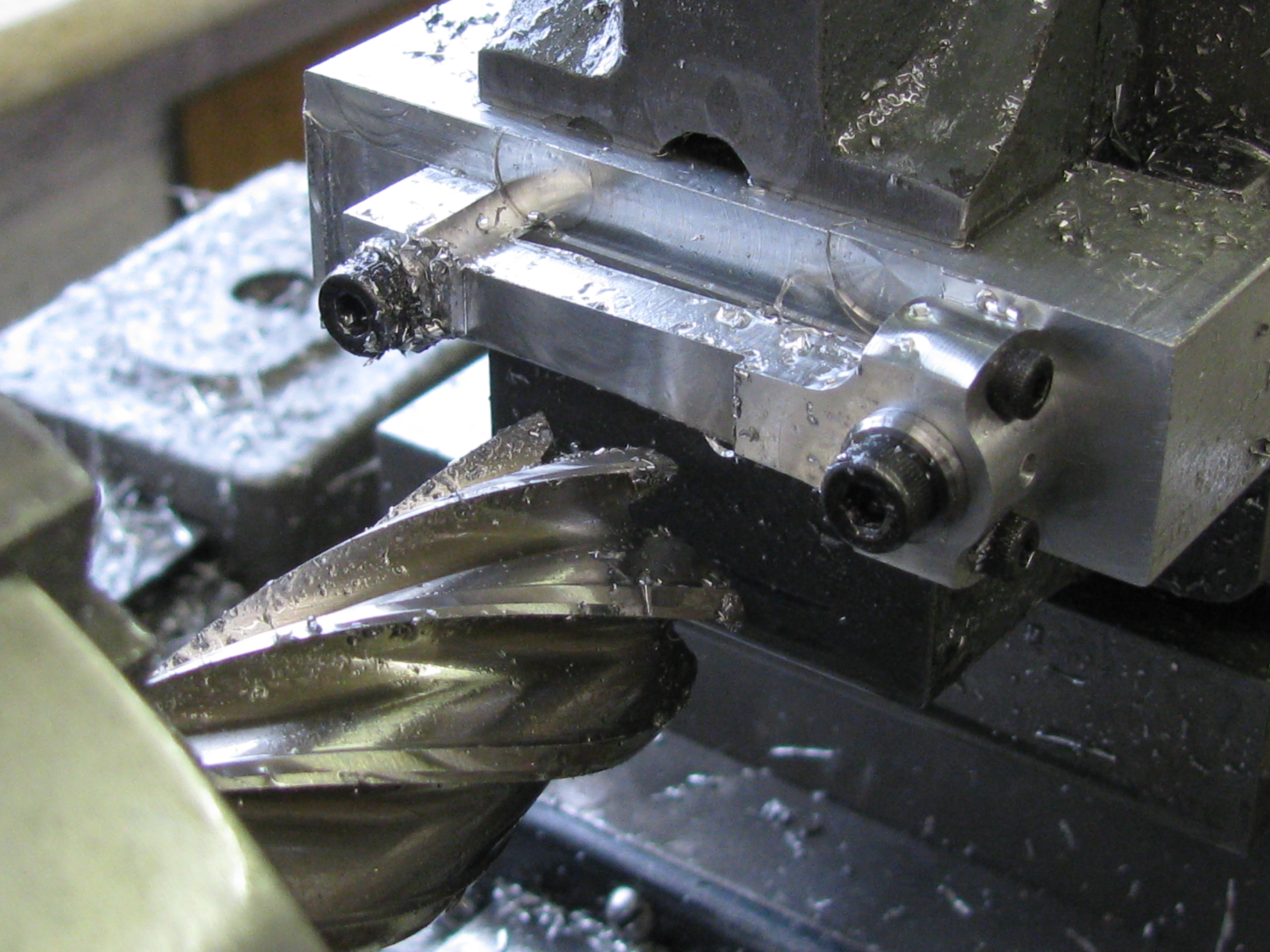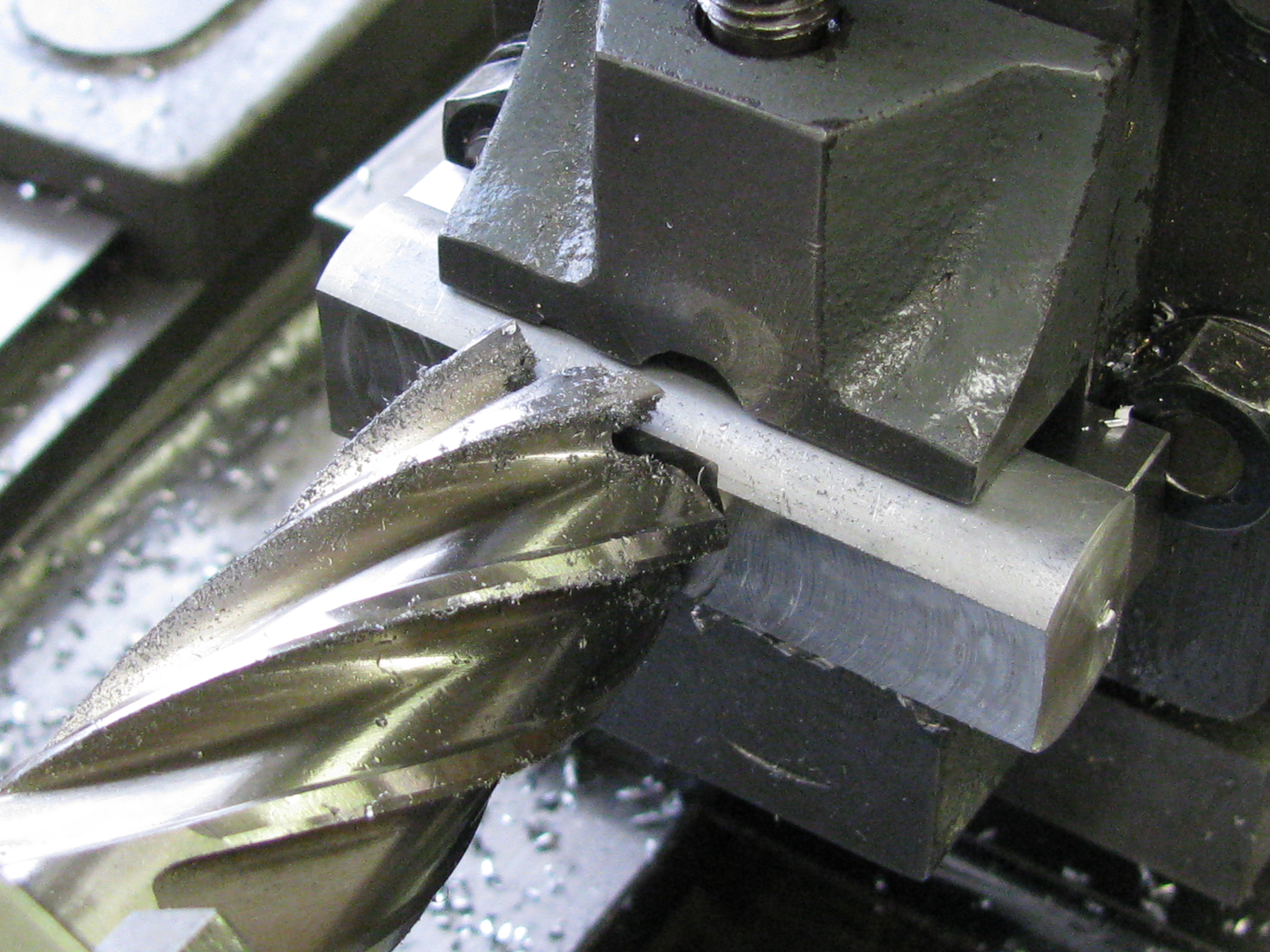 I cut the cap off with a 1⁄16″ slitting saw, leaving about 20 thou for finishing the bolting face, and took rod out of the vice forgetting to mill the sawn face flat. (5 hours)