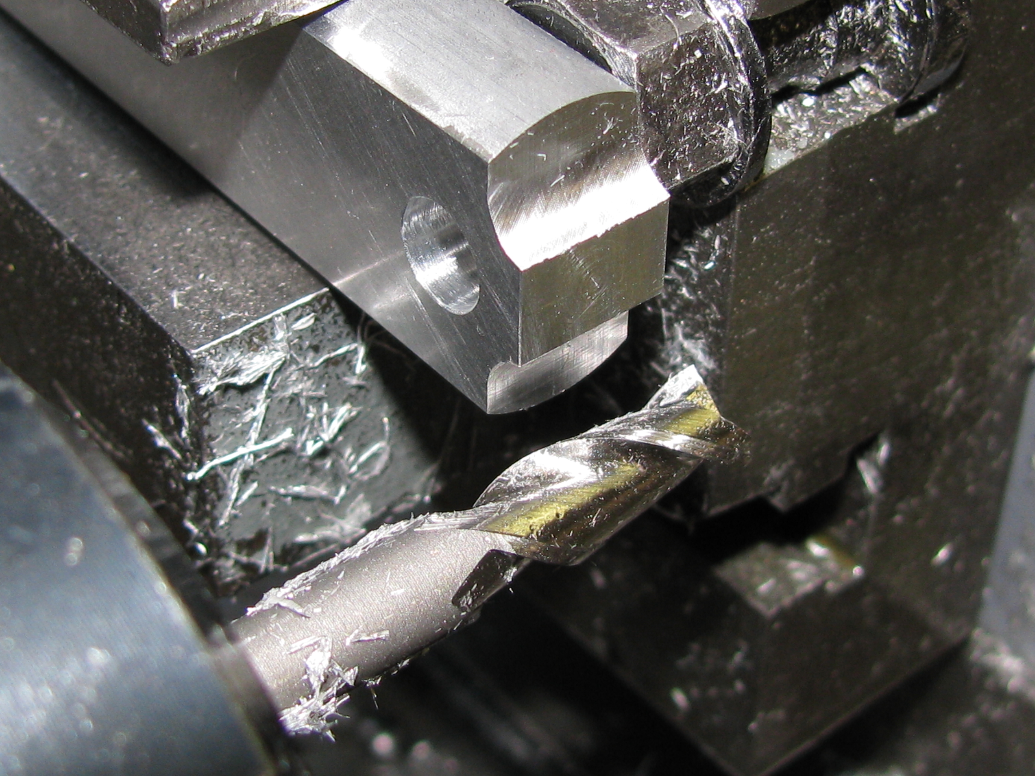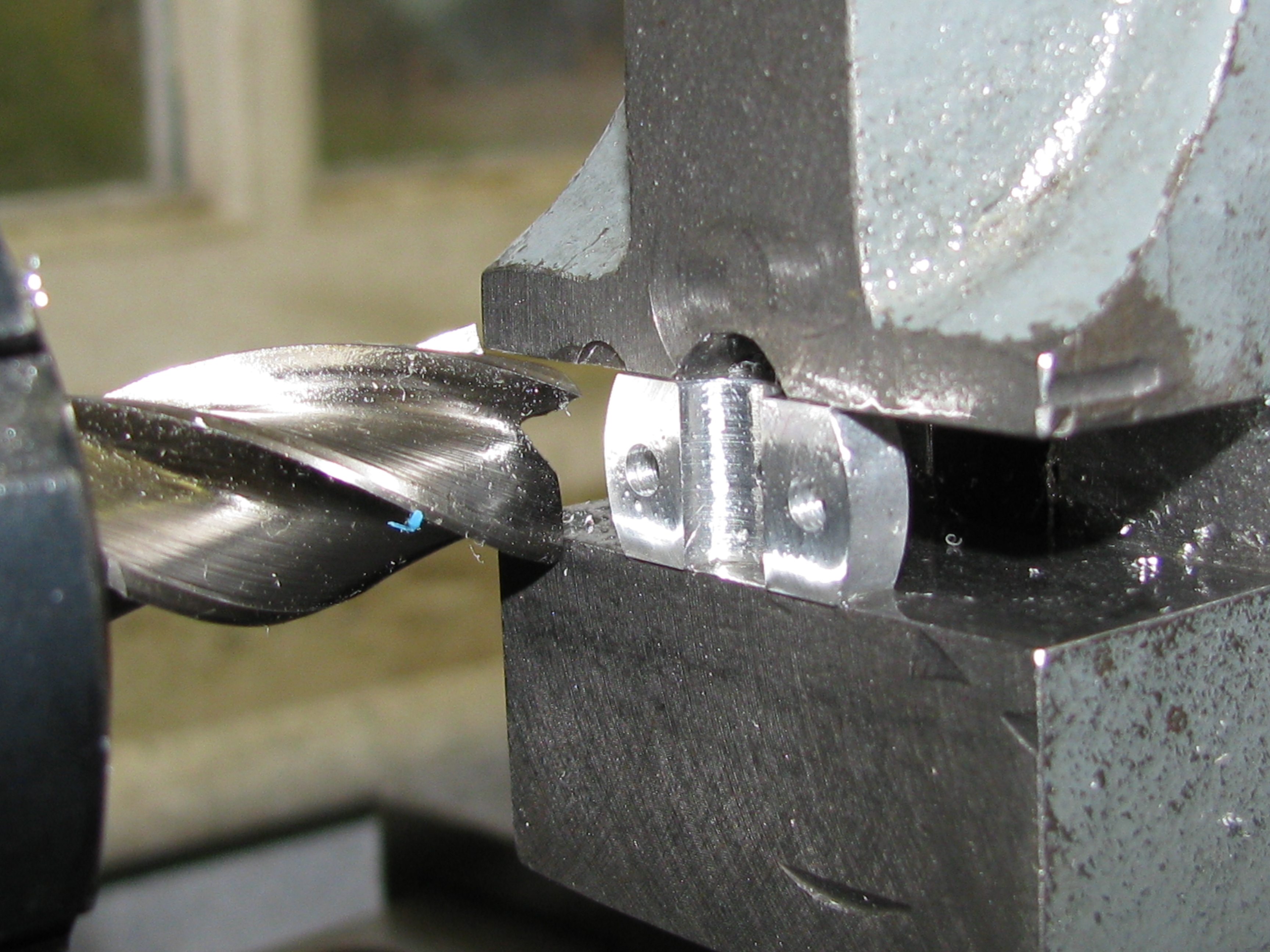 Despite the projection, the top face of the first one clocked up level when the vice was pulled up tight. I drilled the 1⁄16″ oil hole and opened it out to 3⁄32″ diameter for 5⁄64″ depth to take an oil scoop which will be loctited in. I carefully drilled and tapped the bolt holes and milled seating pockets for the cap-head bolts with a 3⁄16″ slot drill, just deep enough to touch full circle.