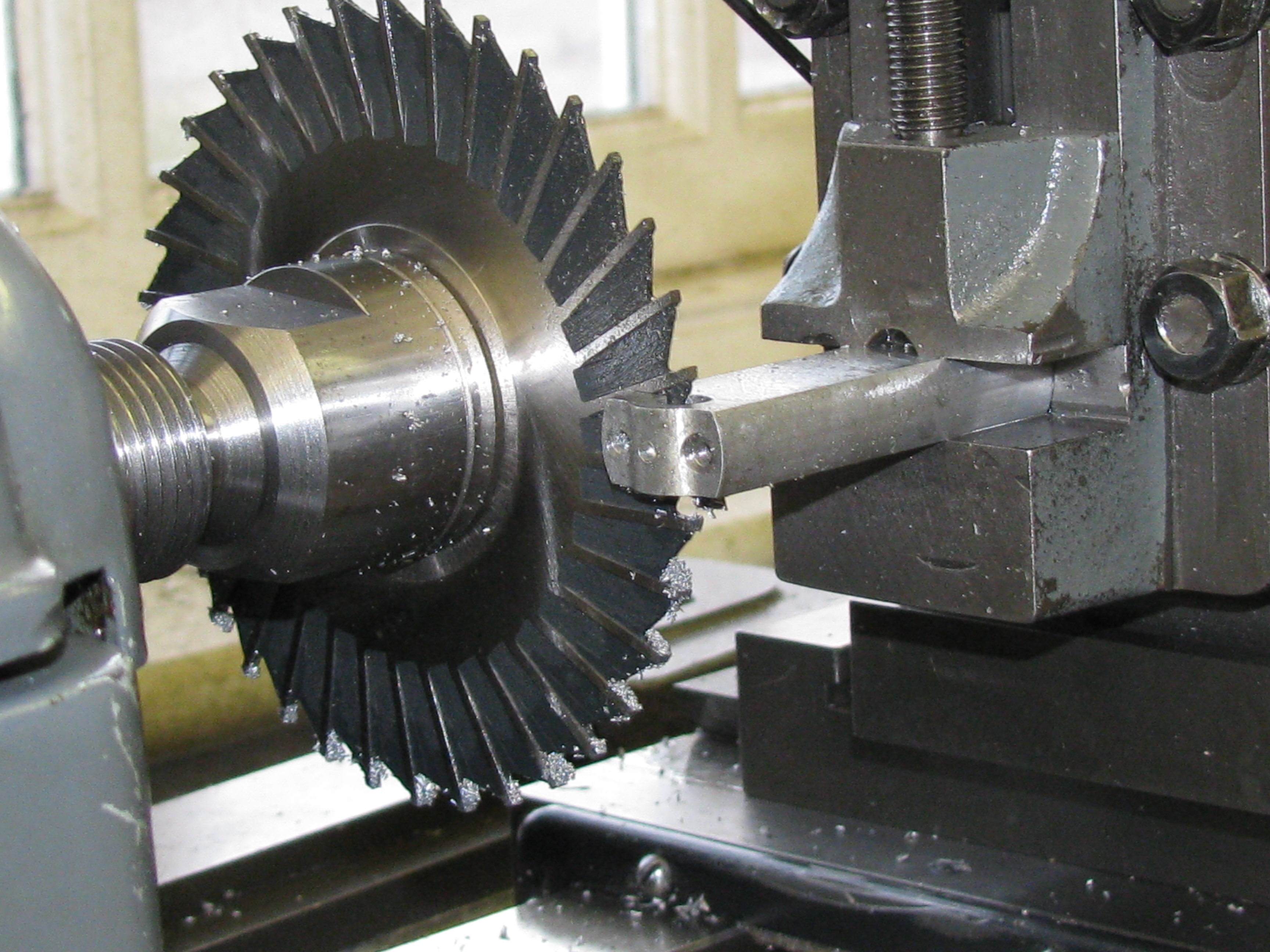 Trying a piece of 5⁄16″ silver steel in the collet chuck I got a run-out of 0.0003″ which would be OK, but I would rather be spot on. Turning a mild-steel stub-mandrel I get a nice finish, dead size. After grinding a tool with a 1⁄32″ radius, I turned the bosses and faced them with just enough clearance between the crank webs, and cut the chamfers 0.008″ on the outside, and internally, feeding 0.018″ at 45° and 0.006″ for the half-angles.