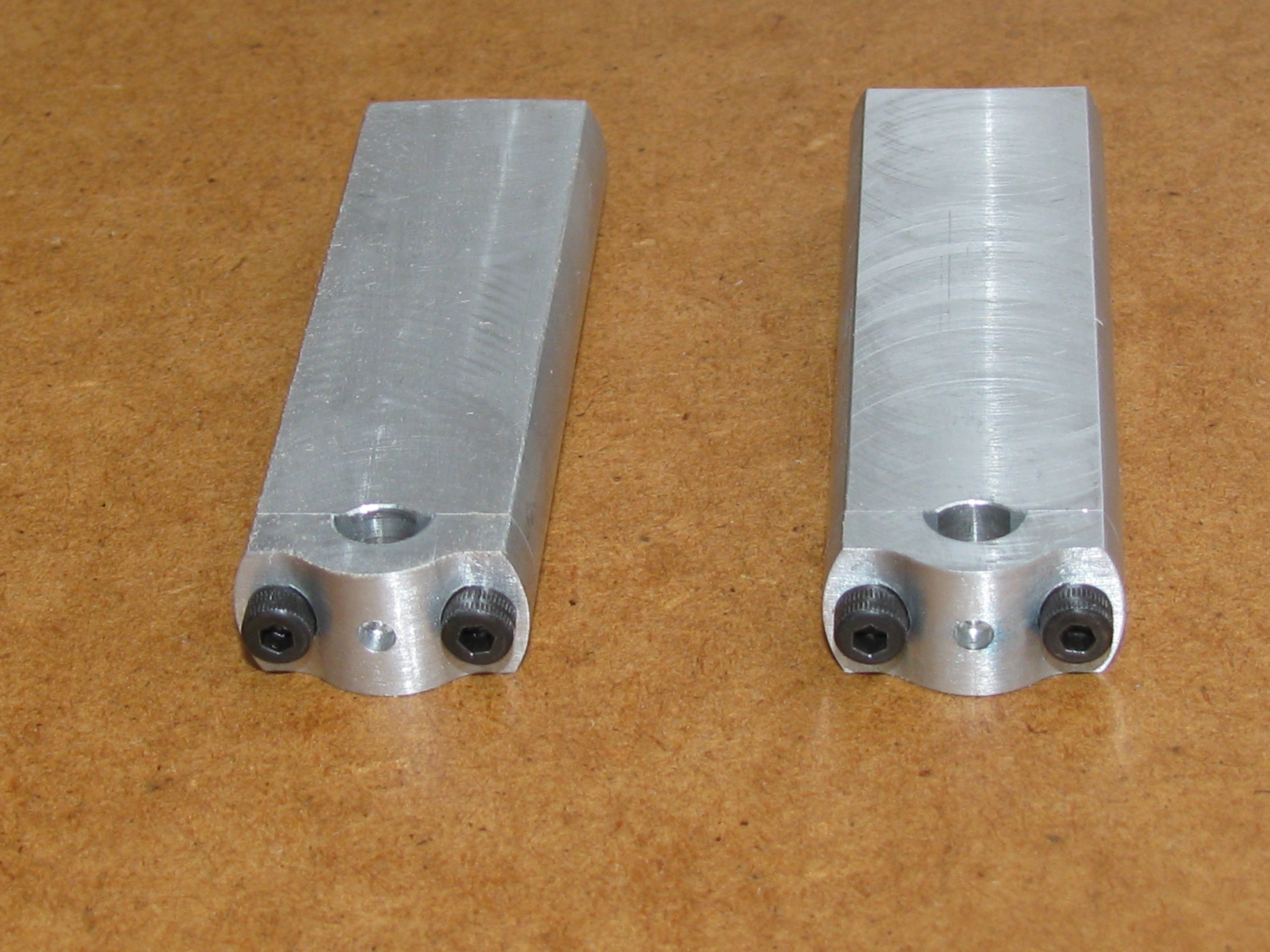 I used a pair of completely over the top set-ups for finishing the scoops; filing would have been quicker and almost as good. First I mounted the rods on a a milling block to trim the scoops to length, and then used the angle setting prop for milling the side cut-away. I adjusted the cut by eye (with headband magnifier) to get the right depth of cut and ensure the whole face was cut, but without cutting into the alloy cap. Getting them right involved sitting on a stool in front of the milling machine with my nose almost on the work. (1¾ hours)