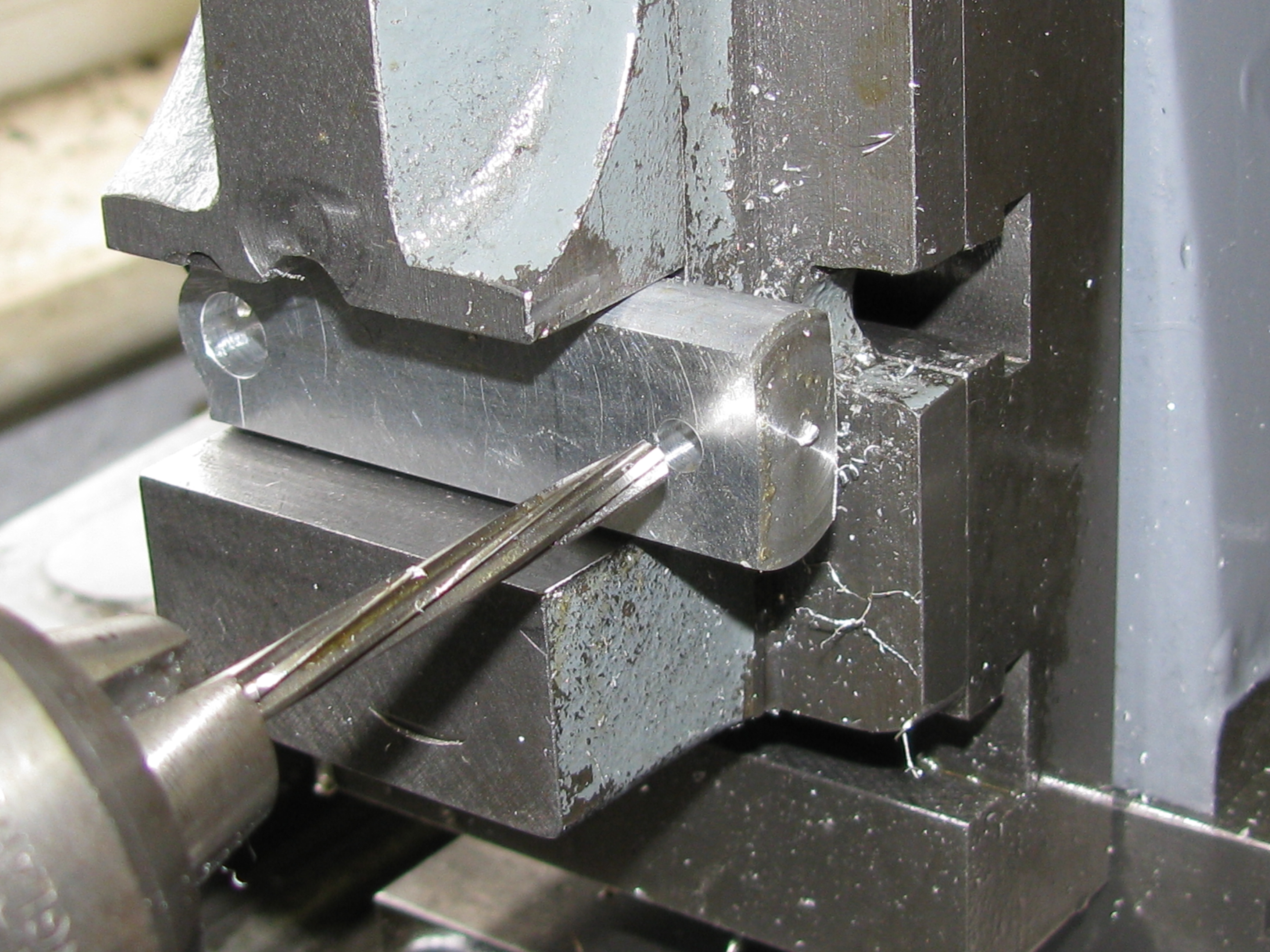 To be sure of getting the holes square to the faces I held the rods in the bottom of the vice jaws with no packing. After lining up carefully, I first restored the hole to round by putting a ¼″ slot drill through, and then used a boring head to take two 0.010″ cuts and one of 0.002′ to leave about 0.006″ for reaming. I thought I had left enough rod sticking out of the side of the vice to be able to get the 9⁄32″ reamer through, but in fact I had to remove one of the vice mounting bolts, and to take the last shave with the reamer by hand after taking the job out of the vice.
