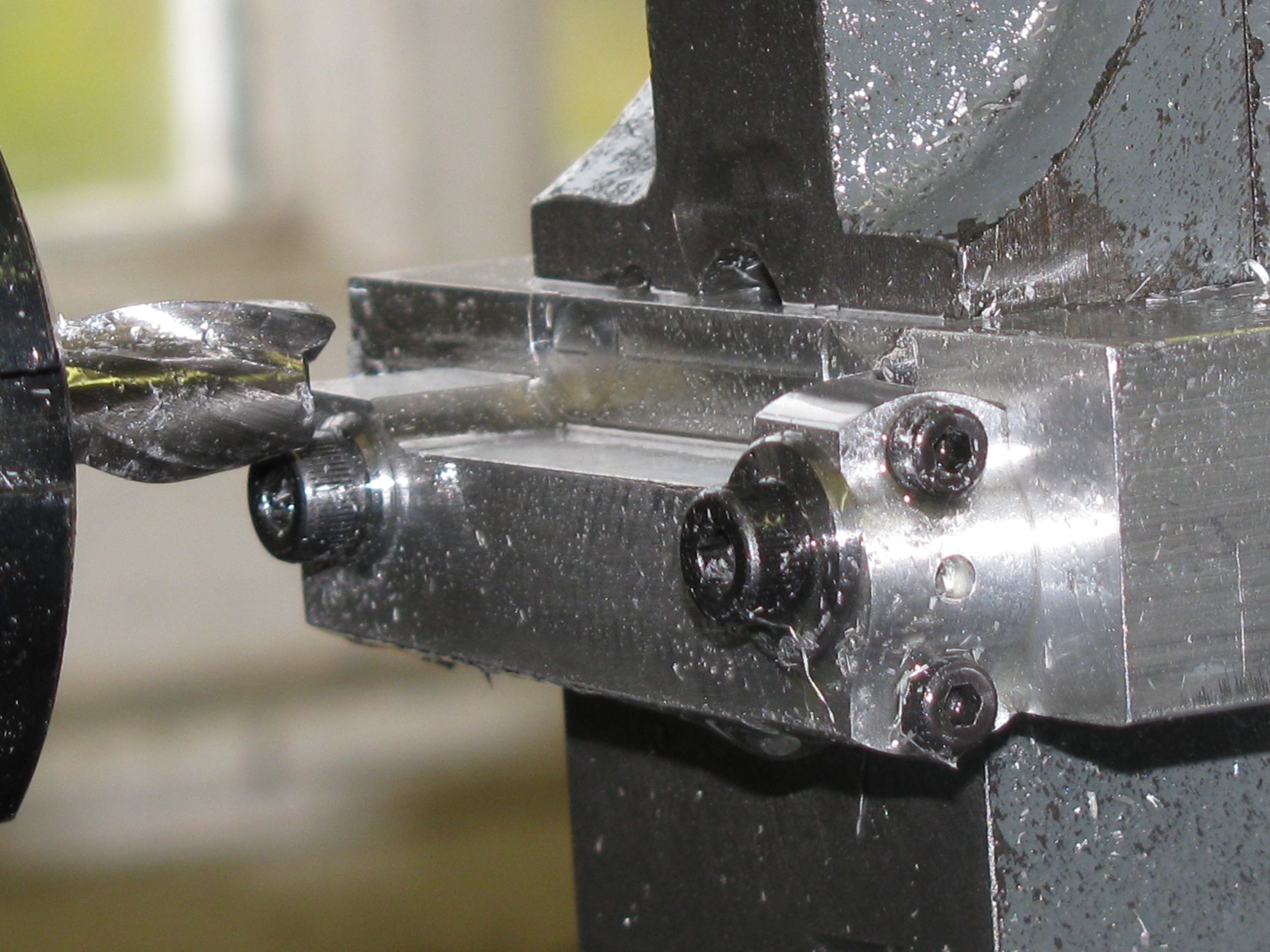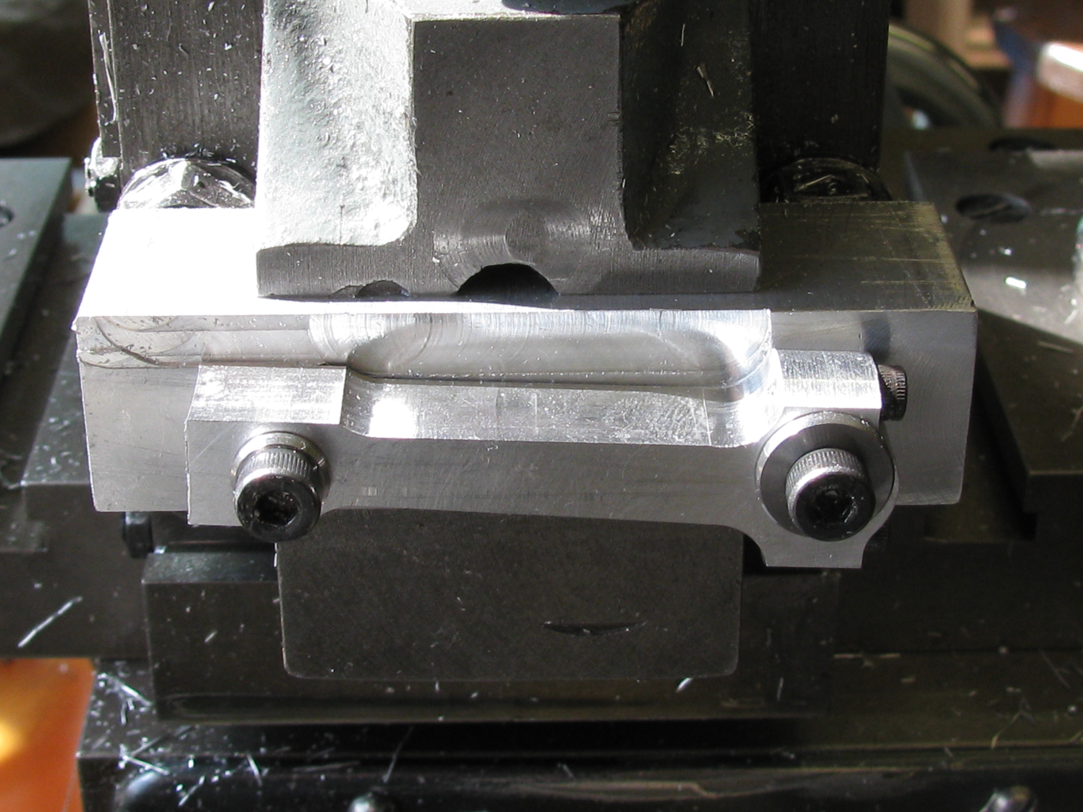 I parted off two 23⁄8″ lengths from the bar provided, leaving a 15⁄8″ piece for other jobs. The parted faces were well off flat and I evidently need to sharpen the parting blade. After facing one end of each I changed over to milling mode and mounted the rods in the vice on the vertical slide for milling the flat sides. I took good care to bed against the packers to get parallel sides, and used a 25mm end mill, in the three-jaw chuck to mill to what turned out to be about 14 thou over the finished 3⁄8″ thickness. It is risky using and end-mill in a 3-jaw as it can creep out of the chuck, unnoticed until too late. But my collet chuck is not big enough and anyway the alloy does not impose high cutting loads and it turned out fine. I drilled and reamed ¼″ holes as close to centre as I could get, and 0.260″ from the faced end, allowing ten thou for milling the cap profile. (3½ hours)
