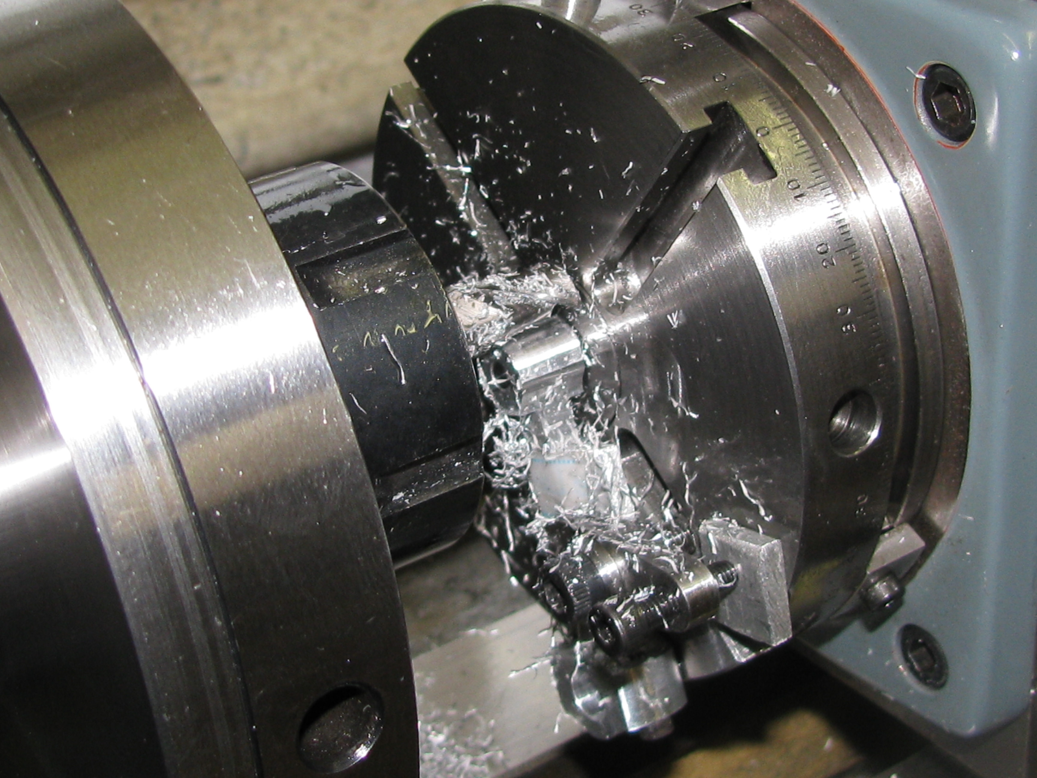 Finally, I hacksawed a piece off an alloy slab to make a fixture for milling the sides of the rods, and while the 4-jaw chuck was still mounted, faced opposite sides of the block. (6 hours)