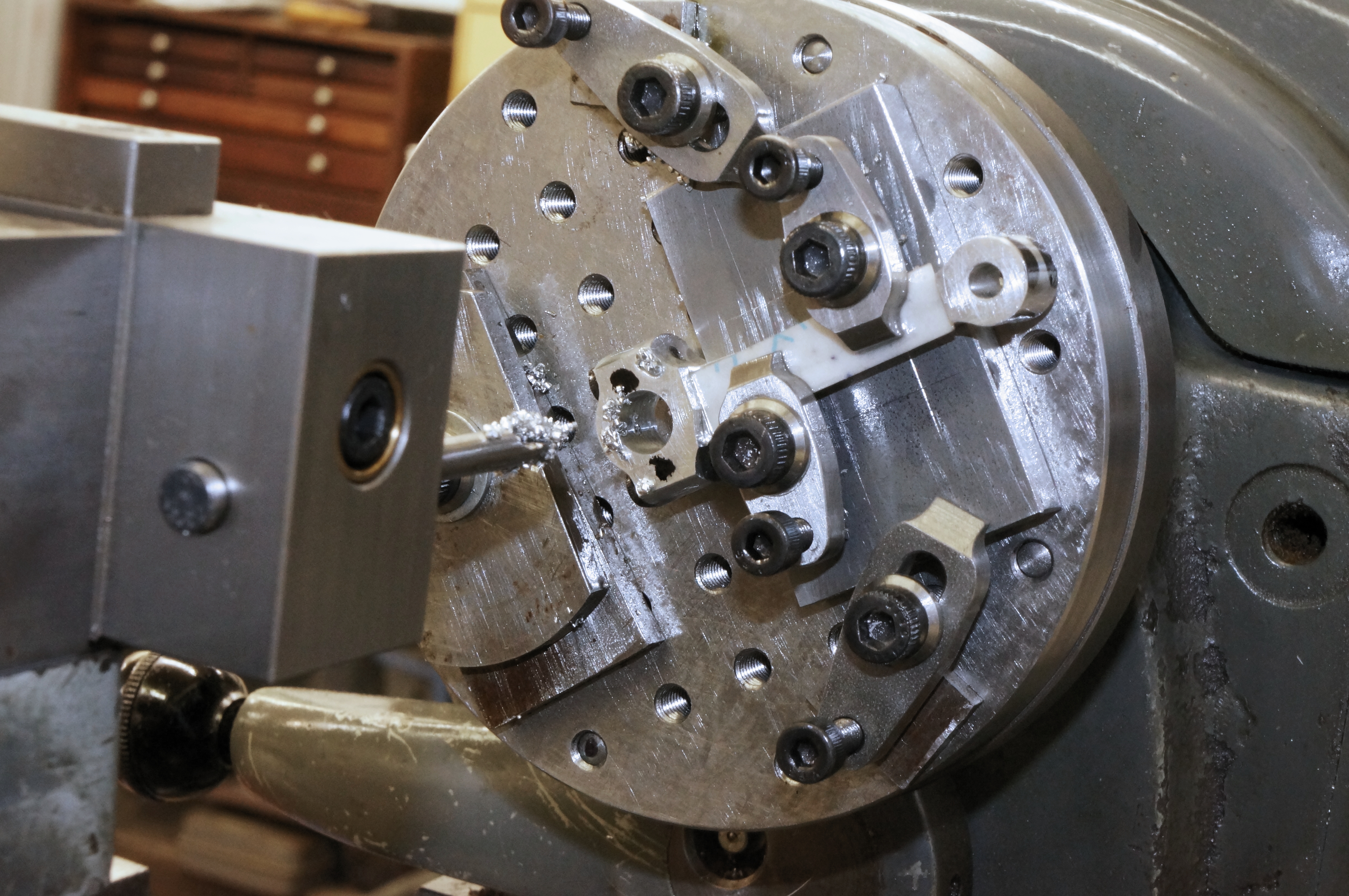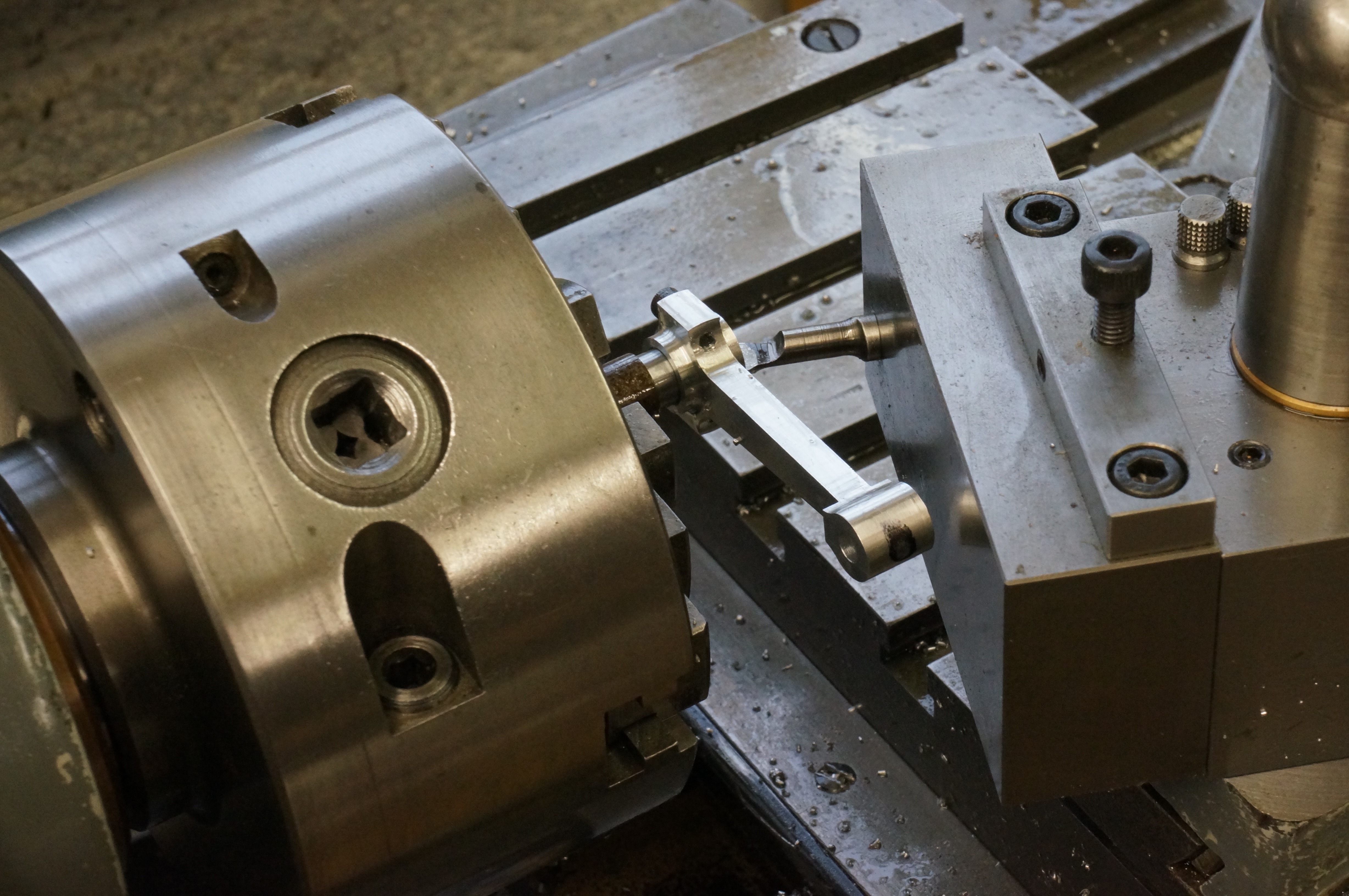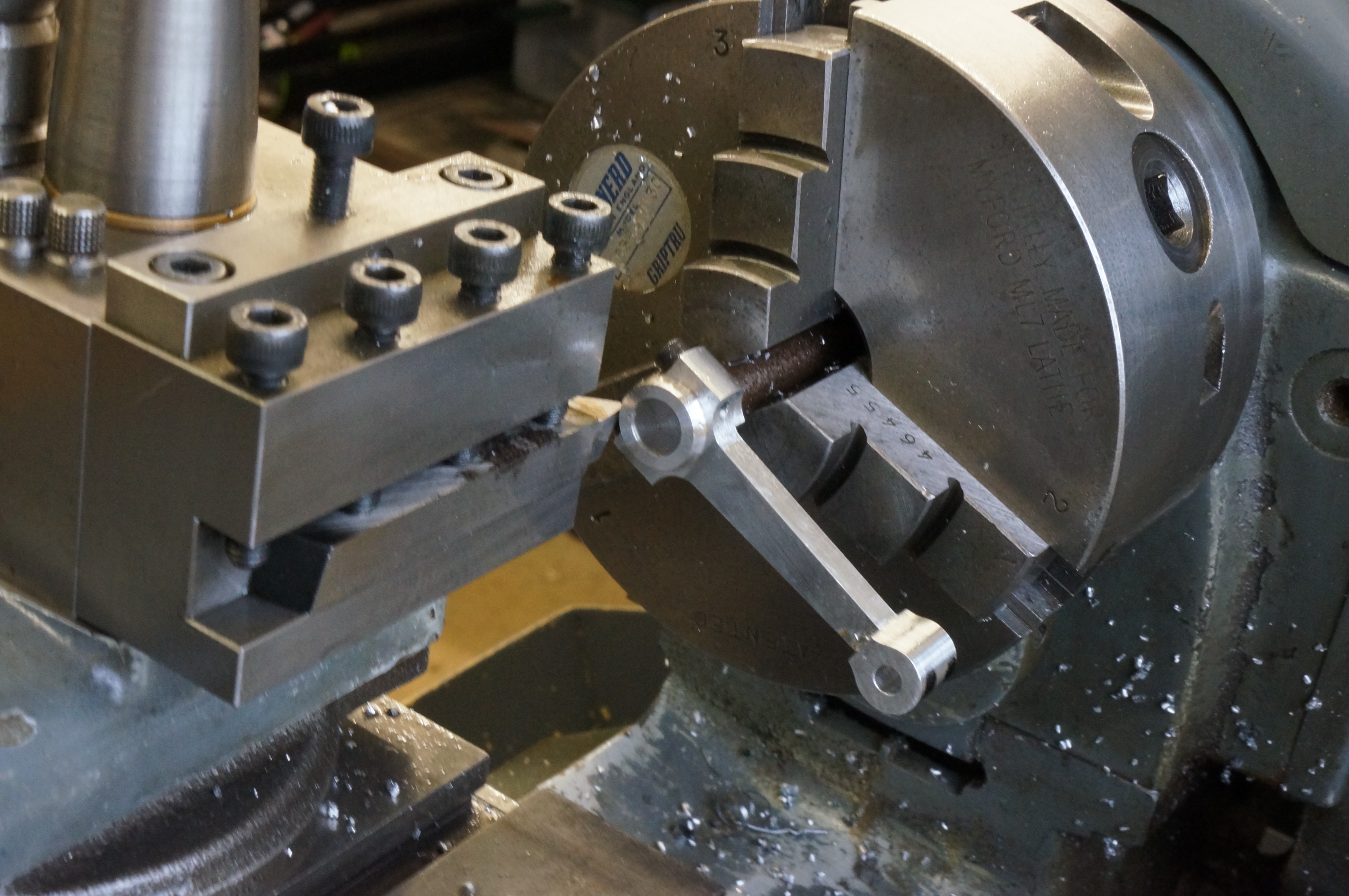 With the 3-jaw chuck replaced with the 4-jaw, each connecting rods was set up true and the outside diameter of the big-end bolting lugs turned to size. This set-up was made easier by not needing softening under the chuck jaws, as all the surfaces will be machined later.