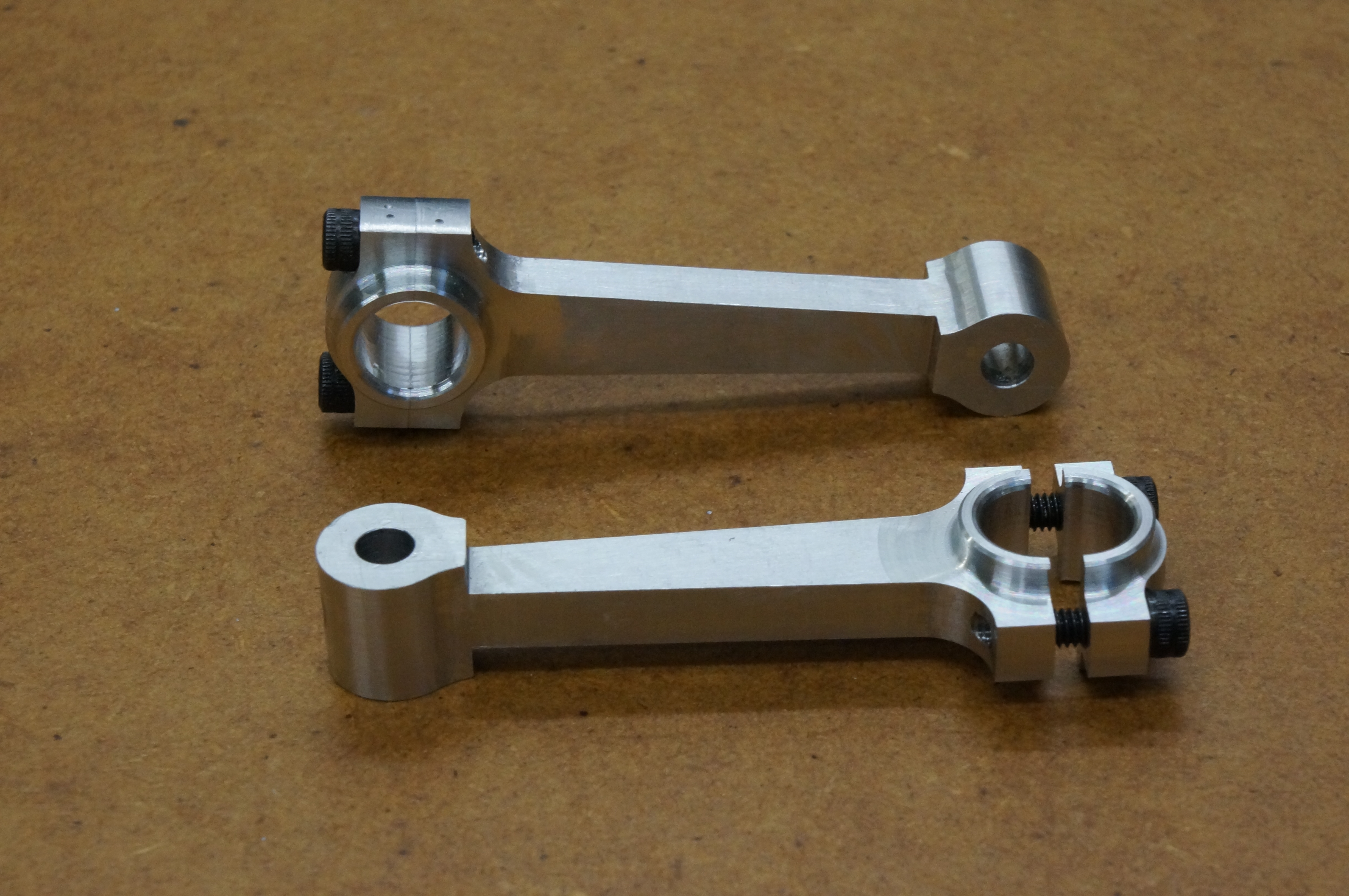A piece of ¾″ alloy (2014A) bar is provided in the kit for these. The drawings assume a bronze casting will be available and are therefore rather uninformative and some of the dimensions that are given do not correspond with the drawing anyway. The original article shows 8BA big-end bolts while the drawing sheets show 6-BA. I have gone for 6-BA cap-heads. I have drawn my rods up as a flat profile 3⁄16″ thick with bosses projecting each side of 1⁄16″ wall thickness. The flanks of the profile are tangential to the pins, and I have used a ruling 3⁄16″ radius except at the big end cap. I have reduced the centres of the big-end bolts to ½″ and reduced the turned OD of the big end lugs by 1⁄32″ while making the bolting lugs 1⁄16″ longer to provide more thread length and thickness under the bolt heads. Westbury and Mason both suggest that fluting the rod to I-section is not necessary with Dural. Calculation shows that fluting would save about 12% of the total rod mass (including bolts). In any case the alloy rods will be far lighter than bronze ones, and I don't want to run this engine at high revs, so I am not going for fluting.