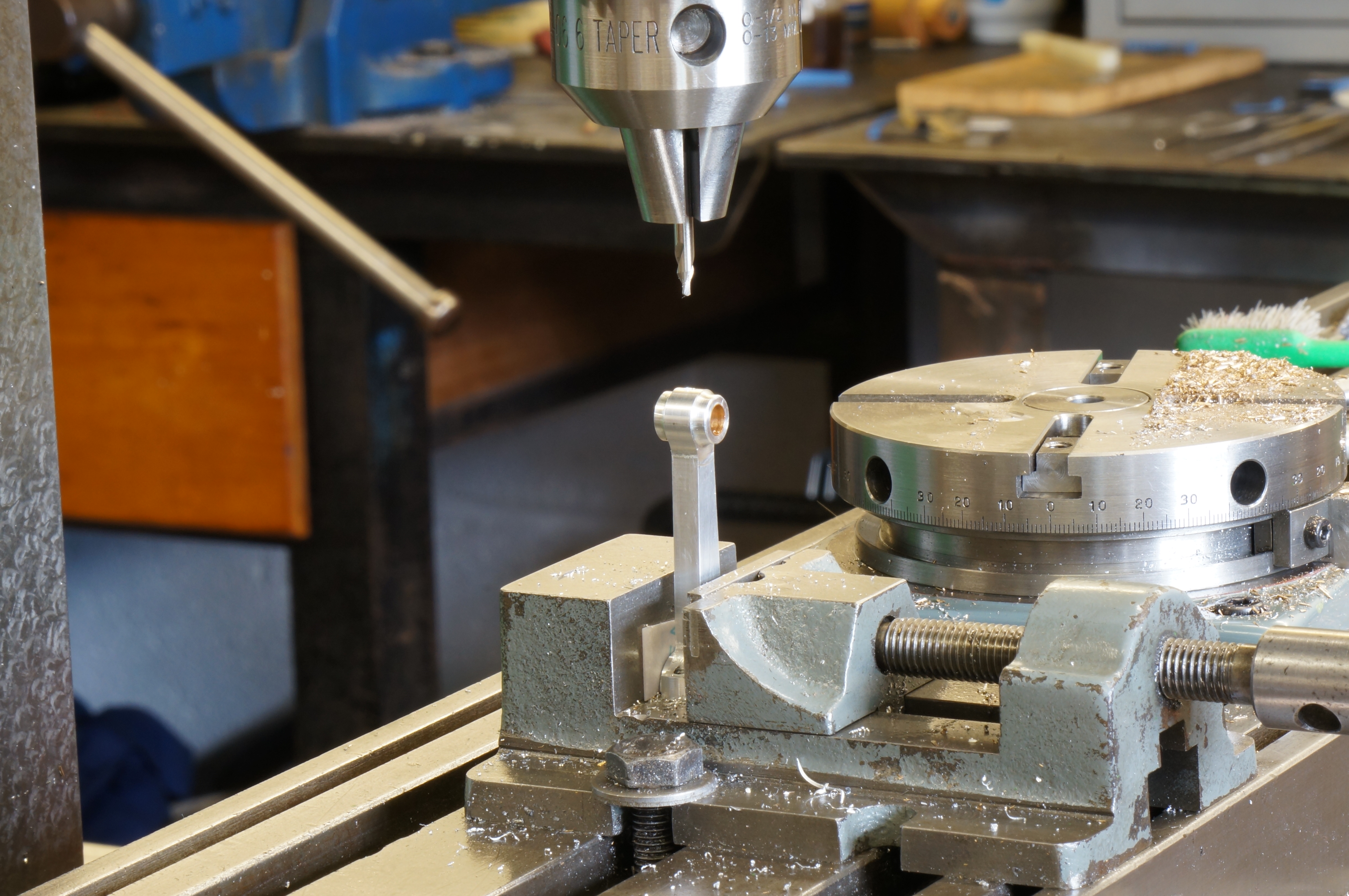 I sharpened a 1.6 mm drill and put the oil holes in the little ends. Checking on the holes for the oil scoops, the holes are a little over size and the scoops would fit better a 0.095″ diameter. I turned them up in brass and Loctited them in place (No 603), leaving them 1⁄64″ over length. Before cutting them down I thought to check the actual clearance over the sump trough. This turned out to be about 0.005″ over design, so nominal will be good. I faced a piece of 3/8 bar to length to make a prop for setting the rods at an angle for milling the leading side cut-away in the scoops. (3½ hours)