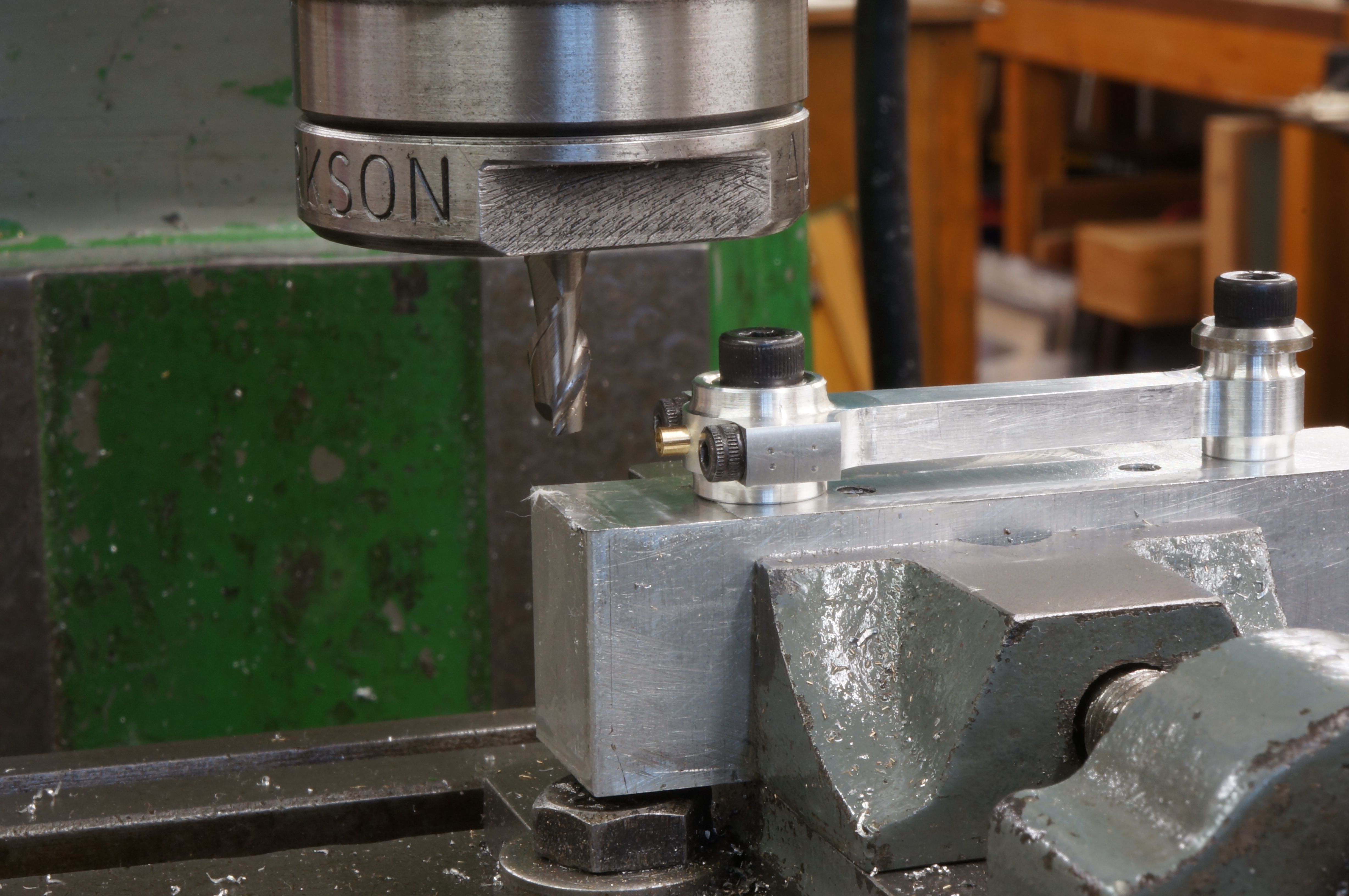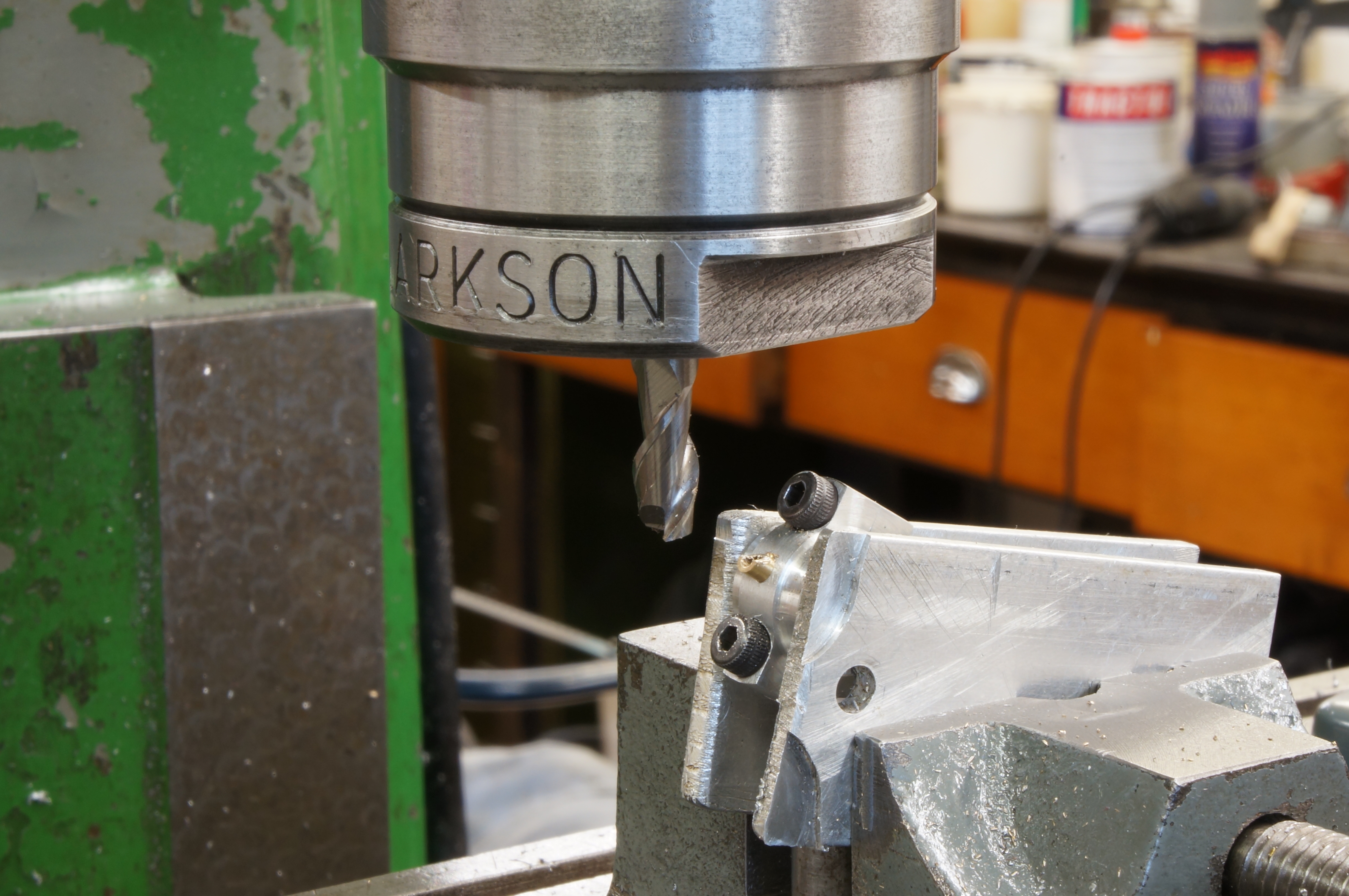 With the alloy block in the milling vice I took a shave off the face to ensure it was true and then drilled and tapped M4 holes 1¾″ apart for mounting the rods.