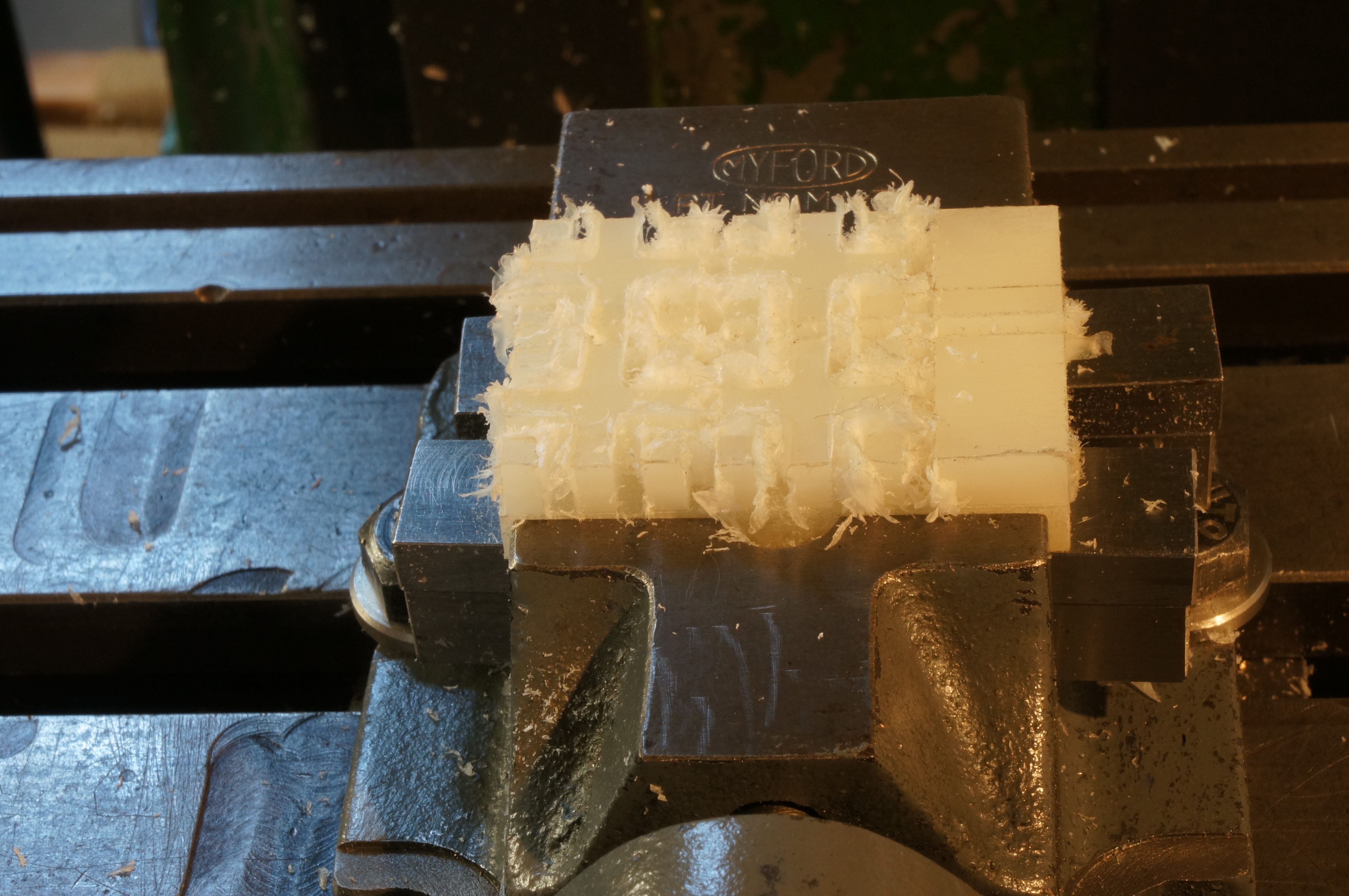 As a part of setting up to run the engine, using the lathe as starter motor, I need a coupling to the timing end of the engine. The starter unit will also drive the timing end of the crankshaft, so I decided to investigate making a suitable coupling. I am thinking in terms of a dog (aka jaw) and spider coupling. and the first consideration is what to make the spider out of. I have a small piece of 10mm thick white nylon plate in the material oddments box, and that seemed a possibility. I cut a piece out and milled it to a rectangle. This produced a lot of burring which is difficult to remove cleanly. (1 hour)