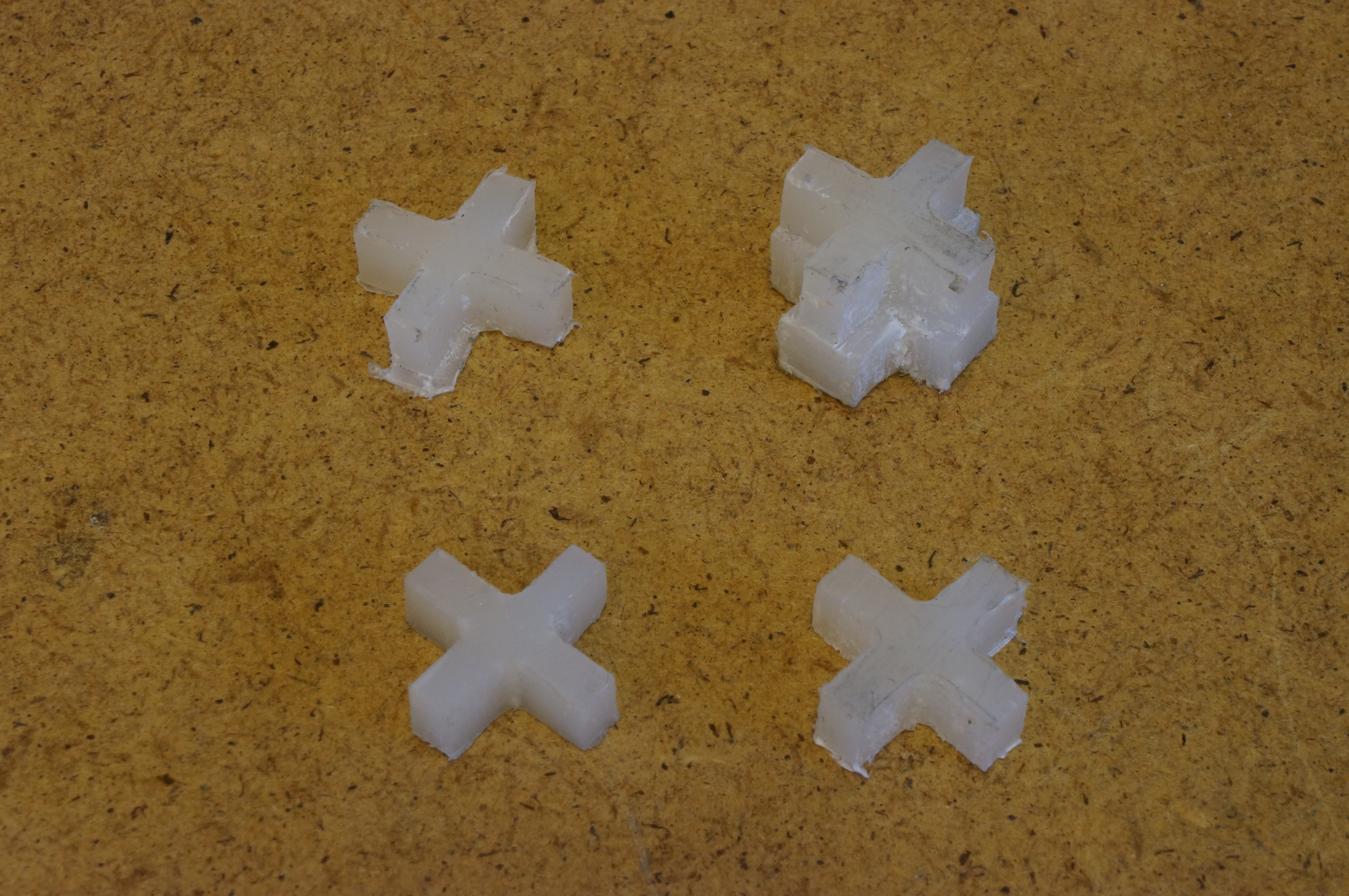 Firstly I milled grooves to form four squares of white chocolate, and then milled out the corners. I used a 3⁄32″ slot drill running at 2200rpm. Again, this produced a lot of burring. A lapse of concentration means two of the spiders will have a thin leg. I decided deburring would be easier with the pieces separated, so I sawed the block to individual pieces and started cutting the waste out of the corners. (3¾ hours)